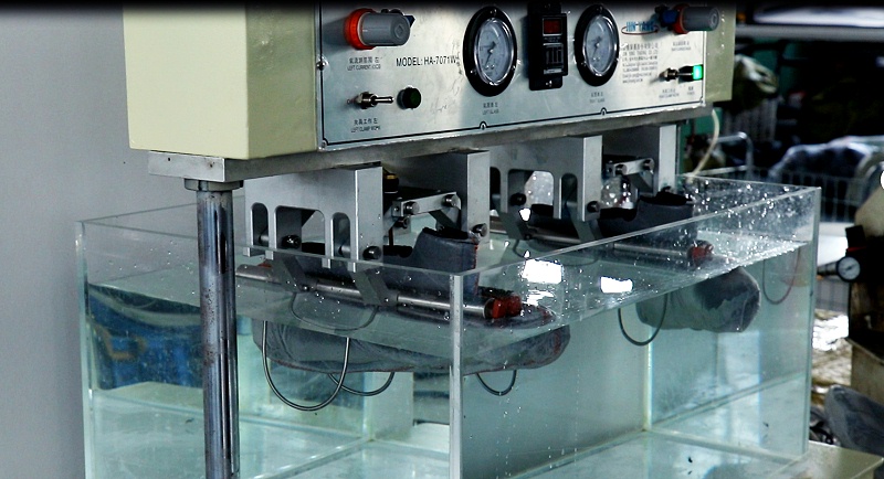 防水襪套測試是通過將空氣灌至襪套里,將襪套壓至水箱內以測試防水度。每一只防水襪套務必置于水槽中作充氣測試,防水襪套務必延伸至鞋子的舌翼頂端或防水線以上5毫米處,發(fā)現(xiàn)漏氣的襪套不可使用。